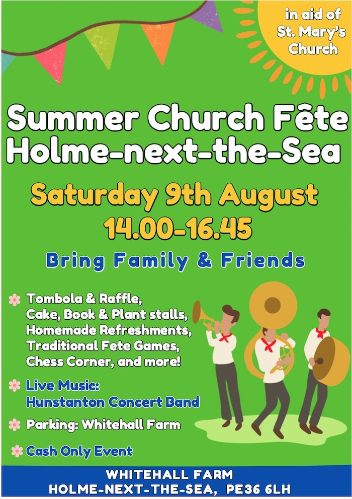 All the fun of the fair at Holme-next-the-Sea Church Fete - cakes and refreshments, Hunstanton Concert Band, raffle, tombola, plants, books and puzzles, dressing up, photos, name bracelets traditional games. The surrounding natural environment can be explored with representatives from the Norfolk Wildlife Trust and an opportunity for moth encounters.
